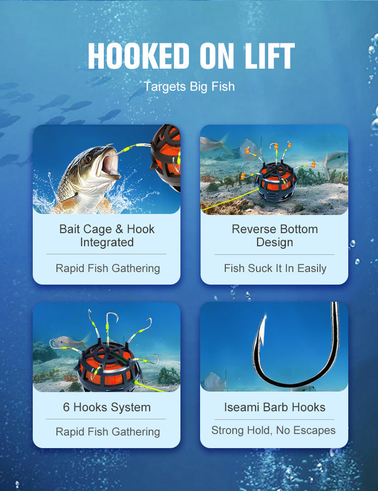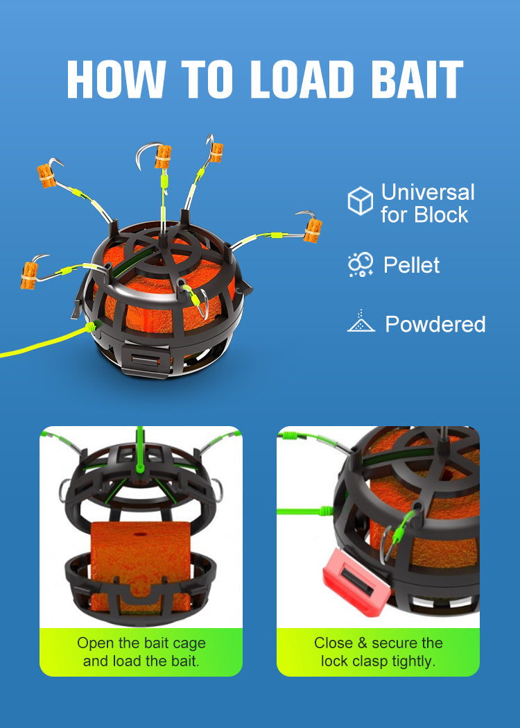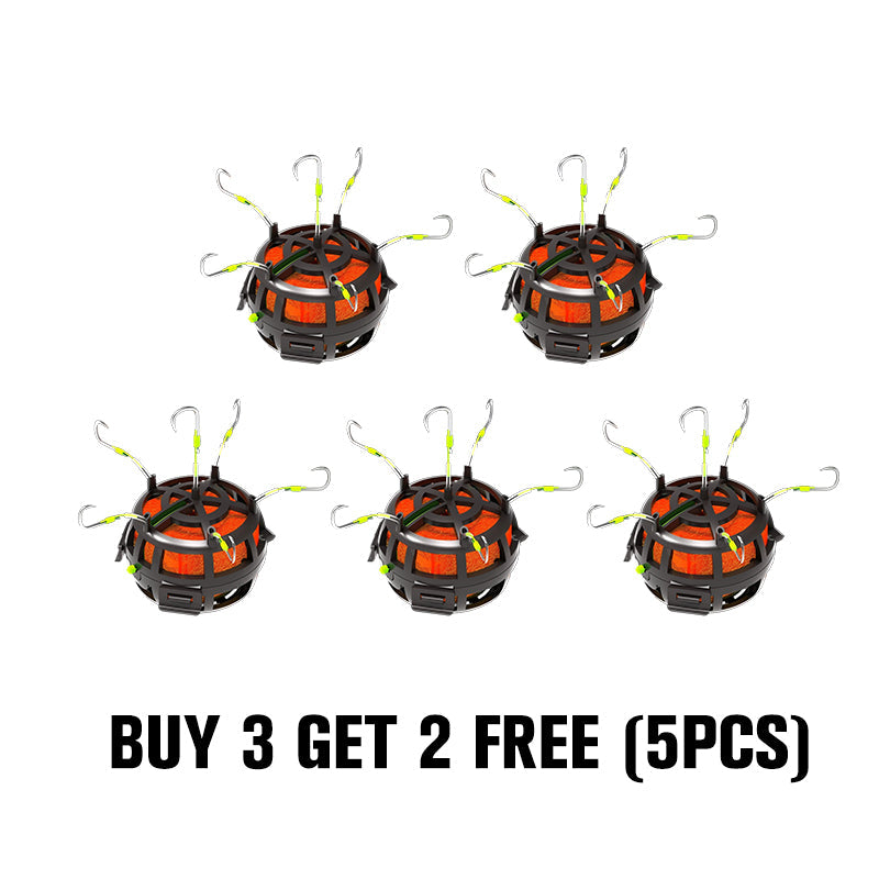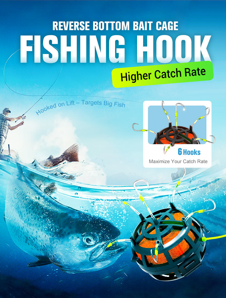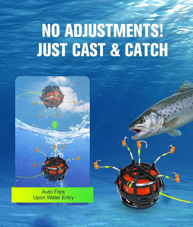 All-in-One-Ködersystem- Kombiniert 6 scharfe Haken mit einem geräumigen Köderkäfig, um Fische schneller anzulocken. Beladen Sie den Käfig mit Würfeln, Pellets oder Pulverködern - so entstehen unwiderstehliche Duftspuren, die das Fressen auslösen.