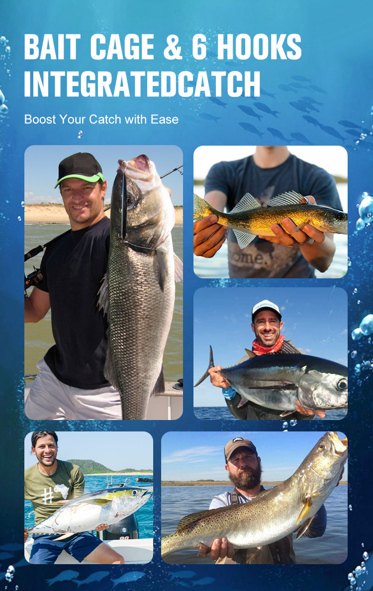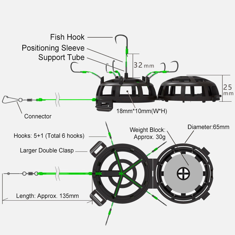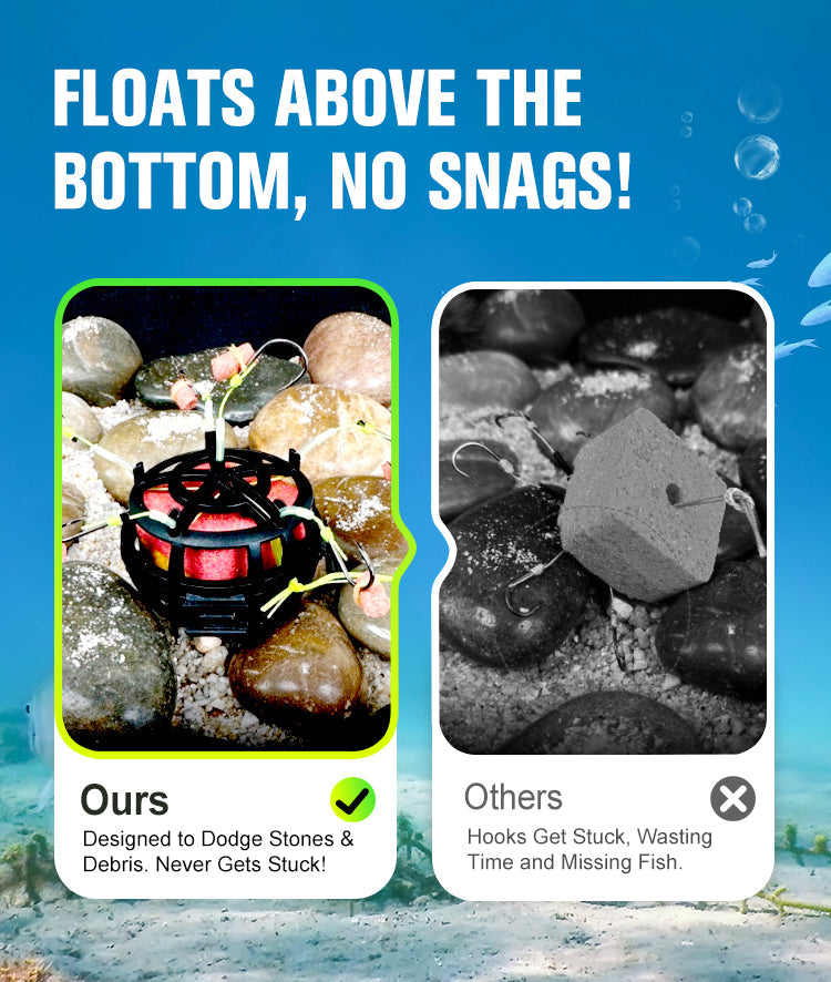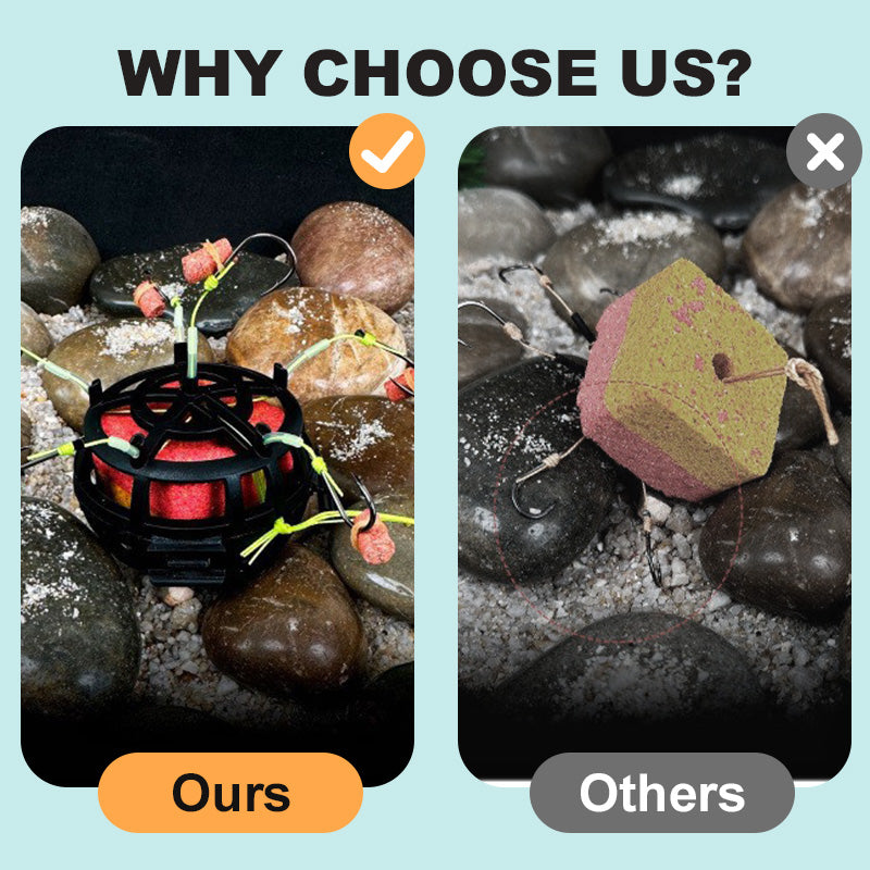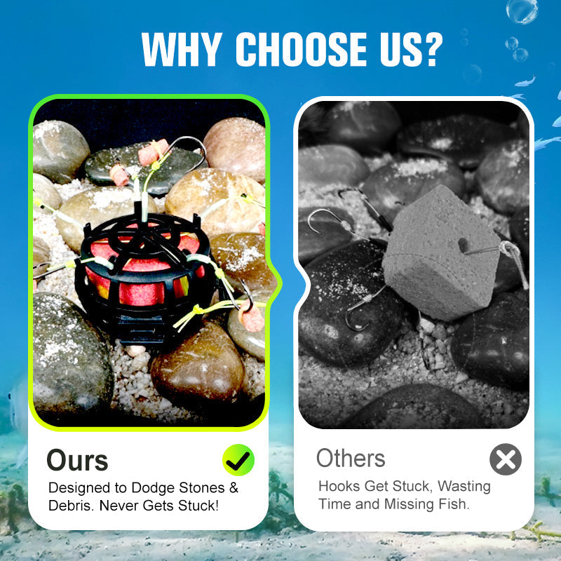 All-in-One-Ködersystem- Kombiniert 6 scharfe Haken mit einem geräumigen Köderkäfig, um Fische schneller anzulocken. Beladen Sie den Käfig mit Würfeln, Pellets oder Pulverködern - so entstehen unwiderstehliche Duftspuren, die das Fressen auslösen.