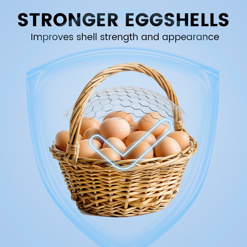 VERBESSERTE EIERQUALITÄT : Stärkt die Schalenbildung für festere, glattere Schalen. Verbessert das Aussehen der Eier mit einem rötlicheren, glänzenderen Aussehen, erhöht das durchschnittliche Eiergewicht und reduziert weiche oder verformte Eier.