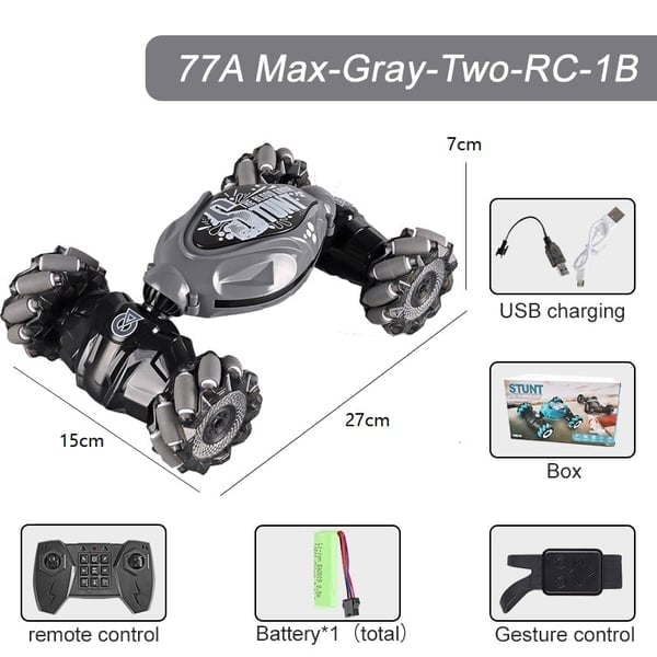 - Dubbele manieren van besturing: onze rc-stuntauto is geüpgraded met 2 besturingsmanieren: zwaartekrachtsensor, horlogebediening en afstandsbediening. U hoeft alleen maar een horloge met gebarendetectie te dragen en een gebaar te maken, en de op afstand bestuurbare auto zal dienovereenkomstig handelen. Of u kunt een eenvoudig te bedienen afstandsbediening met een zendersterkte van 2,4 GHz gebruiken, die gevoelig en responsief is, zodat u zelfs vanaf een grote afstand kunt manoeuvreren. (U kunt het autospeelgoed niet tegelijkertijd in twee richtingen besturen.)