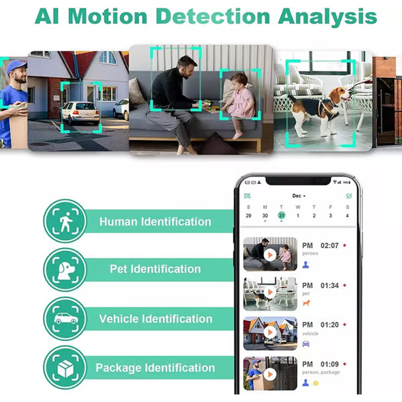 INTELLIGENTE BEWEGUNGSAKTIVIERUNG MIT KI-ANALYSE - Verbessern Sie Ihre Sicherheit mit intelligenter Bewegungserkennung. Die Kamera erkennt Bewegungen nicht nur, sondern analysiert sie auch in Echtzeit, um Fehlalarme zu reduzieren. Bleiben Sie über wichtige Ereignisse informiert und schlafen Sie ruhig, da Sie wissen, dass Ihr Zuhause mit fortschrittlicher KI-Technologie geschützt ist.
